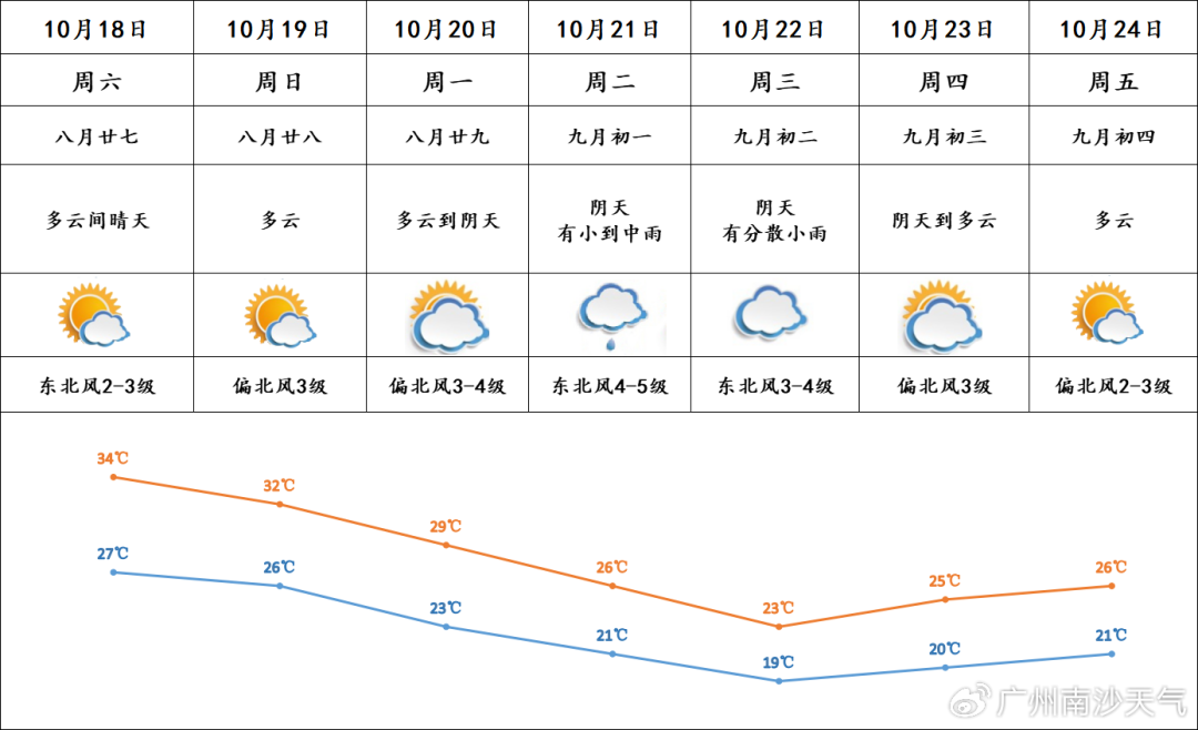 据@广州天气预计,19日到22日,受冷空气和“风神”共同影响,广州日平均气温逐渐下降7—10℃,陆地阵风6—8级,港区和高地阵风7—10级,其中21日有小到中雨。展望23—26日,多云为主,气温逐渐回升。