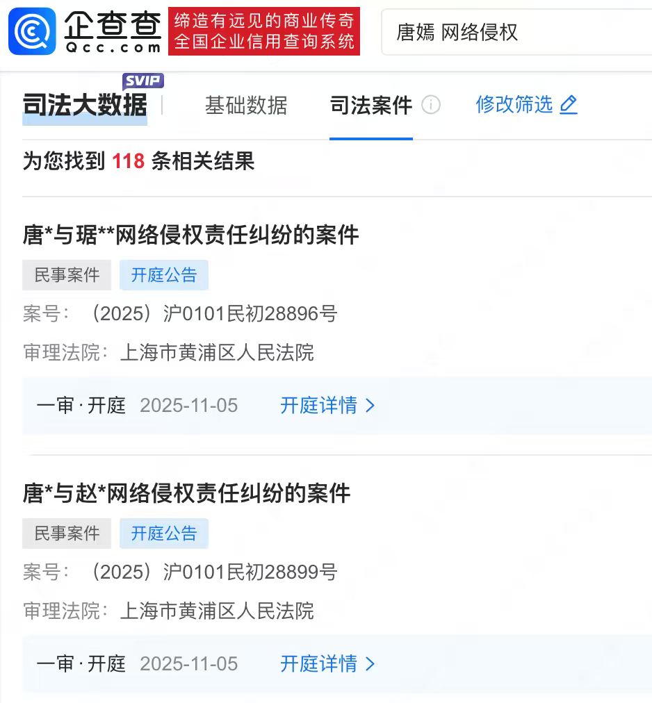 近日,法院公开@唐嫣与琚某某、赵某网络侵权责任纠纷开庭信息,计划将于11月5日在上海市黄浦区人民法院审理。此前,“制片人曝唐嫣迟到一个月未进组”引发热议,唐嫣方发布律师声明否认,并于6月16日发布告黑维权进度公告。